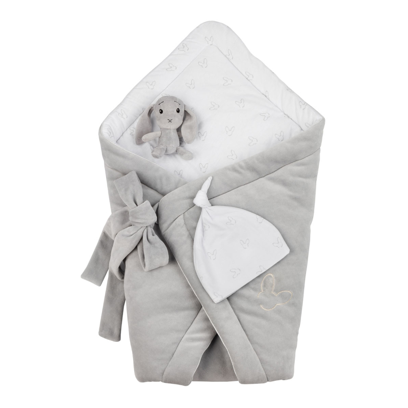 Уютный, очень мягкий - отличный продукт для ребенка в первые недели его жизни. Приятный бархат окутает вашего ребенка и обеспечит ему комфортный сон. Отличным дополнением к ушному крючку является шапка из нежного хлопкового трикотажа. Тонкий отпечаток серых кроликов прекрасно сочетает в себе эти два продукта.